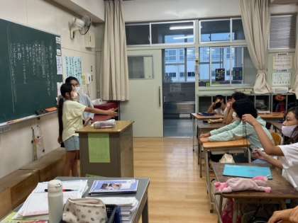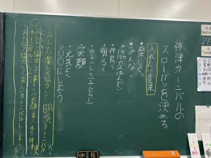 学活の時間に、神津カーニバルのスローガンを決めました。始めにスローガンに入れたい言葉をみんなで出し合い、出た言葉を繋ぎ合わせて考えました。5年2組のスローガンは、「みんなで協力して、楽しく笑顔あふれる神津カーニバルにしよう」に決まりました!!