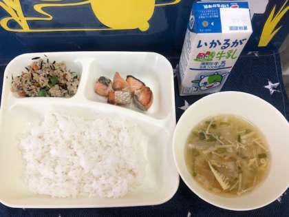 昨日は牛乳提供中止、今日は、牛乳パックの形状が変りました。児童は「何で昨日牛乳無かったん?」「何で形違うん?」「大きいんと違うん?」「味も違う?」など質問がいっぱいでした。