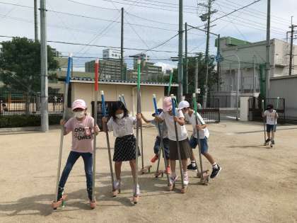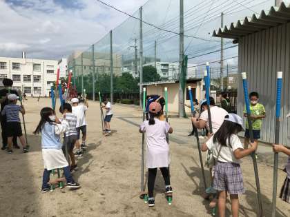 今週は竹馬週間です。普段は鬼ごっこをしたり教室で過ごしたりしている人たちも、今日は運動場に出て竹馬にチャレンジしました。竹馬のこつは、竹馬自体は前に傾けて、自分の体はまっすぐに保つことです。小股で歩き、右足と左足を開けすぎないことも大切です。運動委員の人たちが汗だくになって教えてくれました。補助付きの竹馬に初めて乗った人は、「ハイヒールみたい。」と言っていました。次の機会は木曜日、補助なしで歩くことができる人が増えるといいなと思います。