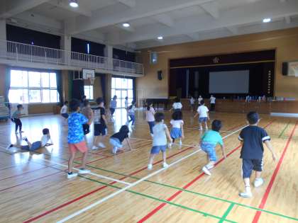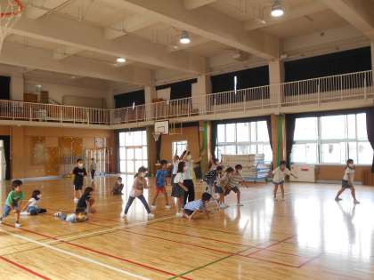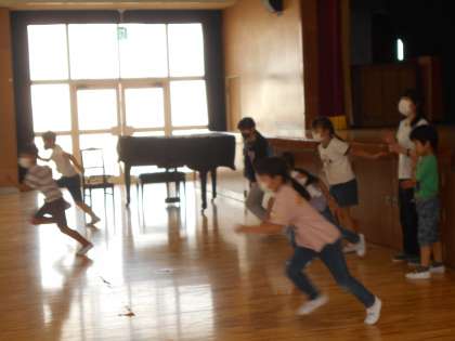 学級活動の時間には、今までクラス全員でしりとりや「いつ・どこで・だれが・何をしたゲーム」や「人間まちがいさがし」をしてきました。今日は講堂で「だるませんがころんだ」をしました。広い場所で思い切り体を動かすことができて、みんな笑顔でした。