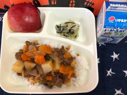 給食でいつも登場しているハヤシライスは、小麦粉から作る「ブラウンルウ」でとろみをつけています。今日は、小麦粉で作った「ブラウンルウ」のかわりに米粉(上新粉)を使っています。