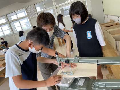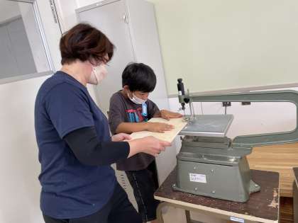 今日ははじめてだったので、先生と一緒に糸のこを使いました。難しい!怖い!と言っていましたが、全員が安全に使うことができました。