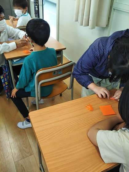 今日の2時間目はたてわり班活動による「折り鶴」作りでした。