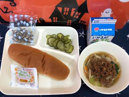 給食のタンタンめんは、チンゲンサイなどが入った汁めんの上に、味つけした肉みそをのせて食べます。