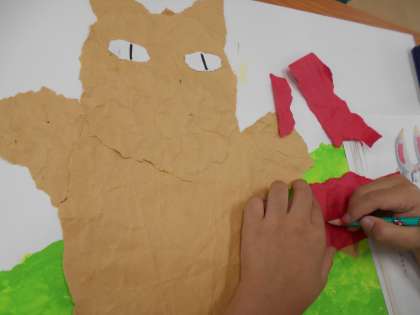 国語で学習している「ニャーゴ」のお話から想像した絵を、図工の時間に作成しています。草原は絵の具で、猫のたまおじさんは貼り絵で、子ねずみたちやその他の背景はクレパスで、と、三種類を組み合わせた大作です。草原は、黄緑色の絵の具を使って点描で表現しました。絵の具と水の量を調整することで濃淡ができ、本物の草原に近づけることができました。難しかったのが、たまおじさんのパーツを画用紙に描いてクシャクシャにし、手でちぎってパーツを作ることでした。悪戦苦闘する人が続出…。今日はなんとか画用紙に貼り、目と口も作るところまでできました。後はみんなが得意なクレパスで仕上げをすれば完成です。どんな作品が出来上がるのか、楽しみです。