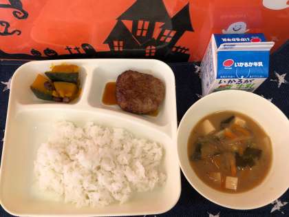 今日の給食では、かぼちゃのいとこ煮にあずきが使われています。