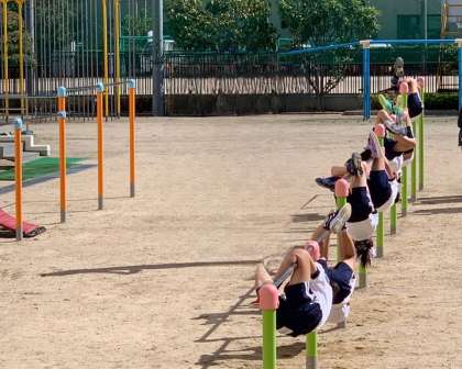 体育の学習で固定遊具(鉄棒)を使ってぶら下がりの練習をしました。3分間ぶら下がり続けるという目標を達成できる児童が増えてきました。自分の順番まで待っている児童からは、「頑張れ!」や「あともう少し!」といった温かい応援も聞こえてきました。