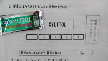 かむことの大切さを知るために、キシリトールの咀嚼チェックガムを使用しました。