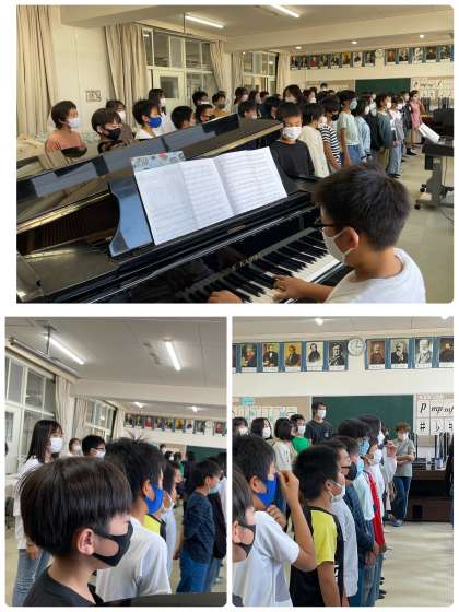 声の質に合わせて、歌う位置を決めていきました。2クラス合わせると歌声は大きくなりますが、綺麗に合わせるのは難しかったです!まだまだここから頑張っていきたいですね!2組のみんなは友だちの伴奏のすごさに驚いていました!いつも練習ありがとう。