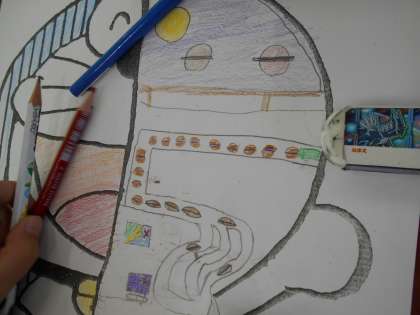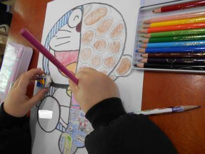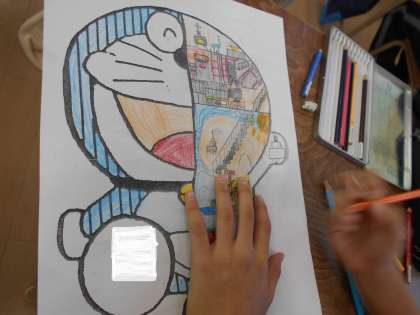 今日は完成した「ニャーゴ」の絵の鑑賞をしました。まずは自分の絵の振り返りをしました。やはり猫の形にちぎるところを難しいと感じる人が多かったですが、完成すると達成感があったようです。その後、友だちの絵から描き方や塗り方、アイディアを学びました。描かれた背景からオリジナルのストーリーを想像するのが楽しそうでした。その後、ドラえもんの中身を考えました。「頭のところにねずみセンサーが入っている。」「食べたどら焼きが運ばれている。」「のび太くんがとった0点のテストを隠す場所がある。」など、どの作品も想像力が豊かで、見ているだけでわくわくしました。