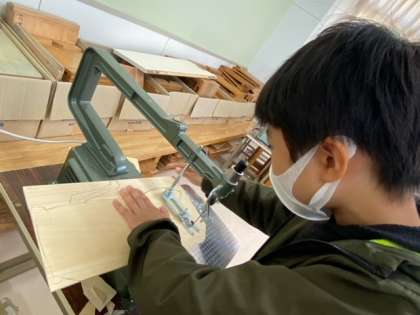 今日は、ホワイトボード作りが始まって2回目の学習でした。前回の続きから、電動のこぎりで板を切りました。初めての時は「怖い!」と言っていた人も、今日はスイスイ切っていて、慣れてきた様子です。