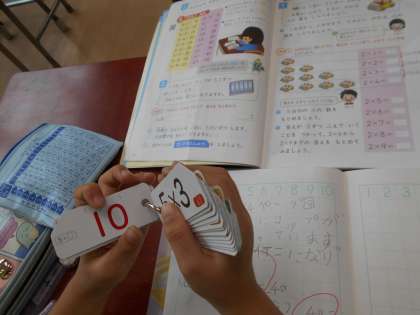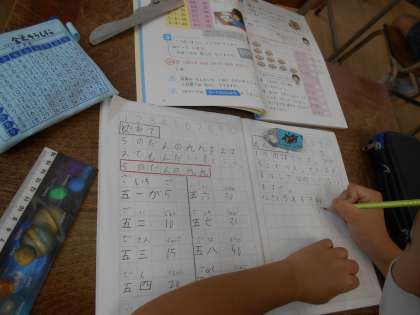 かけ算(1)の学習が第5時に入り、今日は5の段の九九を学びました。前時までかけ算の答えはたし算を使って求めていましたが、九九を覚えるとすぐに答えがわかります。1から9の段すべてを覚えるのは大変ですが、九九はこれから先の算数の学習や日常生活でで必ず使うので、諦めずに最後まで取り組んでほしいです。
