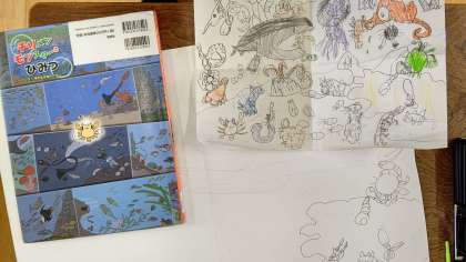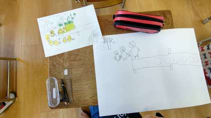 今日は骨組みになる線を描きました。下書きを拡大して書くことが難しく苦戦している児童もいましたが、紙を四つ折りにして窓を作り、窓に何が描いているのかを意識しながら書くことで、思っていた大きさに拡大することができました!