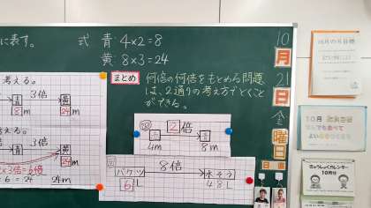 ペットボトルが2Lでバケツはペットボトル4杯分、水槽はバケツ2杯分です。水槽は何リットルでしょう?の問題に、ペットボトルの量からバケツの量を求め、バケツを2倍し水槽を求める方法と、ペットボトルの何倍が水槽になるかを求めて考える方法の二パターンを導き出すことができました。