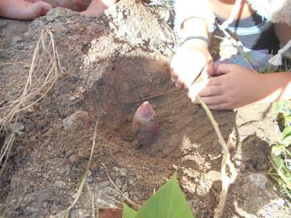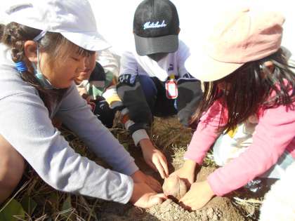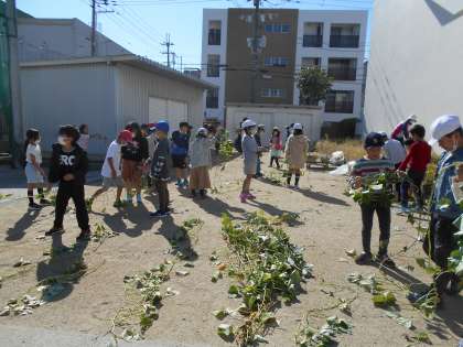 今日は学習園に植えていたさつまいもの収穫をしました。いもを傷つけないように、まわりの土を両手でそっと掘りました。大きいのはいくつかで、残りは小さなさつまいもでした。茎と葉はとても長くて立派でした。