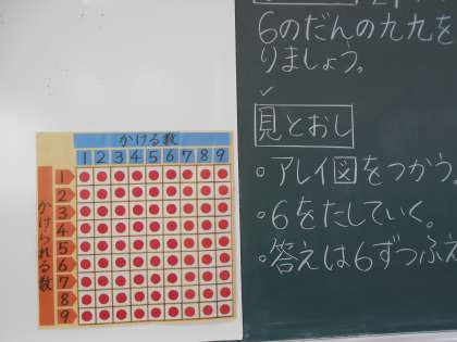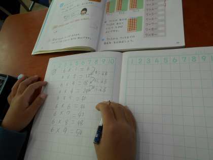 2〜4の段の九九は合格者が増えてきました。段数が上がるにつれて覚えるのは難しくなりますが、九九の作り方はどの段も同じなので、みんなよく理解しています。自信を持って発表できる人や、自分で計算して九九を作ることができる人がたくさんいます。6より上の段は、アレイ図を使って考えます。引き続きがんばってほしいです。