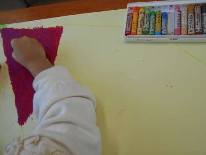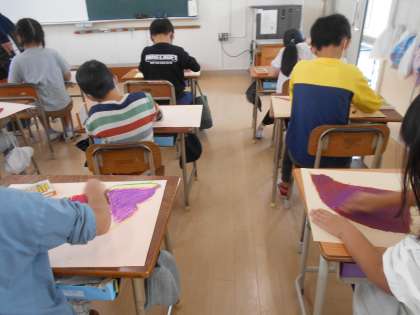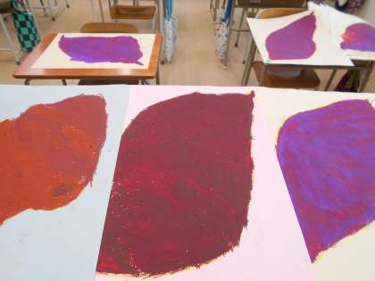 サツマイモの絵の続きをしました。本物よりも大きなイモを、クレパスでしっかりと塗り込んでいきました。茶色系、紫系、赤系…と、同じクレパスの色でも、使う分量によって出来上がりの色味が異なりました。みんな一生懸命塗ったので、手が、画用紙に描いたサツマイモと同じ色になっていました。下地に選んだ色画用紙の色味と相まって、いい色のサツマイモが仕上がってきました。次の図工の時間には、茎や葉を描き足します。