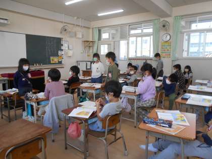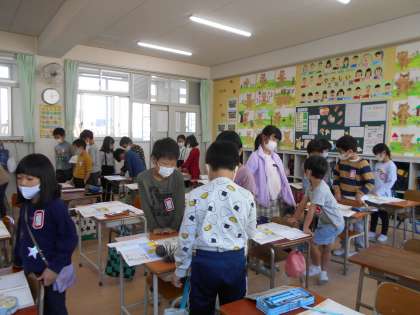 今日の学習は「あたたかい心」『くりのみ』でした。食べ物を探しに行ったきつねとうさぎ。たくさんドングリを見つけたのに、「何も見つけられなかった」と噓をつくきつね。何も知らないうさぎは、やっとの思いで見つけた、しなびた2つの栗のうちの1つをきつねに分けてあげようとします。「食べ物を見つけられなかったら死んでしまうかもしれないのに、大切な栗をあげるってなんてやさしいんだ。」「嘘をついた自分が恥ずかしい。うさぎさん、ありがとう。」などと、うさぎのあたたかい心に触れて涙を流したきつねの気持ちをよく考え、グループや全体で交流しました。「挿絵のきつねの顔が最初はめっちゃ悪そうやったけど、どんどん変わってる!」と気付く人もいました。
