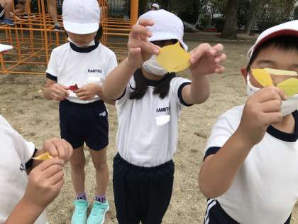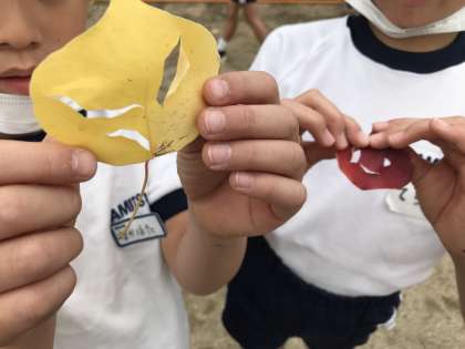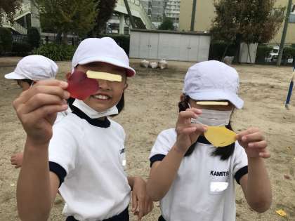 第2グランドで、きれいに色づいた落ち葉を見つけました。赤や黄色、茶色、オレンジ、黄緑…それぞれの色が混ざった落ち葉もありました。穴をあけてお面にしている人もいました。この前のサツマイモの葉よりは小さかったようです。