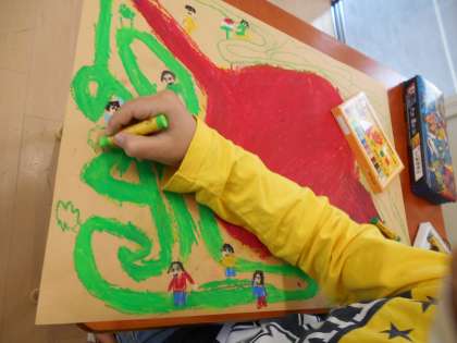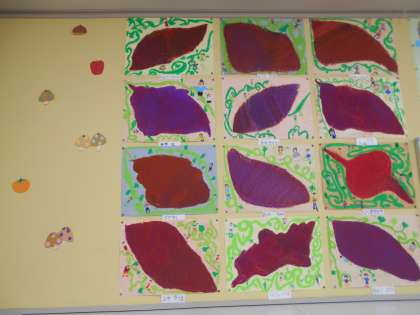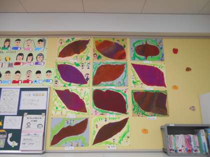 3週間ほどかけて取り組んできたサツマイモの絵がついに完成しました。手も服も机も床もサツマイモ色に染まりながら完成させた力作です。最終日の今日もサツマイモのつるを二重線で描いてからクレパスで色を塗り込むことに苦労していました。出来上がった作品を掲示すると、近くで見るのとはまた違った味わいが出ました。