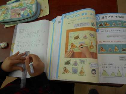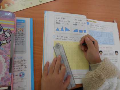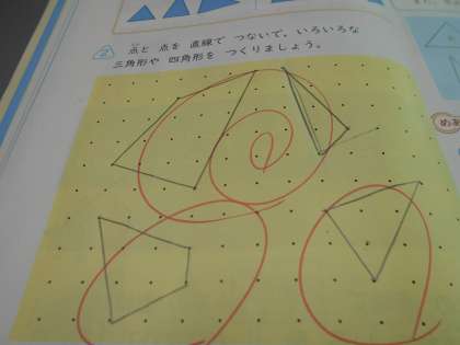 「三角形と四角形」の学習に入りました。言葉を聞いたことはある人がほとんどでしたが、定義を学ぶのは初めてです。動物の周りにある点を定規で結び、直線の数に着目して2つの仲間に分けるところから始めました。定義を知った後は、点を結んで自分で三角形と四角形を作ってみました。いろいろな形の三角形や四角形ができました。