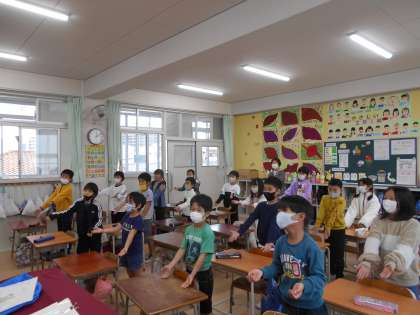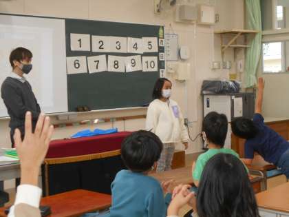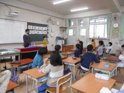 今日はダニエル先生の外国語の授業がありました。まず、9月の終わりに学習した数字の言い方を復習しました。前に出てきて手をたたき、その回数を友だちに当ててもらうという活動もしました。その後、"How are you?" と聞いて "I'm fine / sad / tired / sleepy / happy / hungry."などと答える練習をしました。一番覚えにくかったのは"tired"でしたが、ジェスチャーをしながら繰り返すことで、だんだん言えるようになりました。最後はペアでそのやりとりを交互にしました。楽しく学んだ1時間でした。