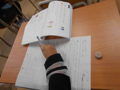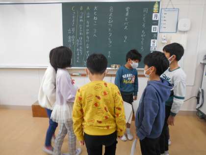 今日は「同じところ、ちがうところ」の発表をしました。「色鉛筆とクレヨン」「電車とバス」「犬とねこ」など、2つのものを比べて共通点と相違点を見つけ、それを文章にする学習です。「色鉛筆とクレヨンは、どちらも色をぬる文房具です。」「電車は線路を走り、バスは道路を走ります。」「犬とねこは鳴き声が違います。犬はワンワンと鳴いて、猫はニャーニャーと鳴きます。」など、みんな教科書を参考にして文章を書き、友だちと伝え合いました。学習発表会の後とあってか、内容はもちろん、声の大きさやはやさを意識して発表できる人が多かったようです。