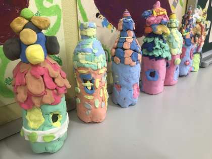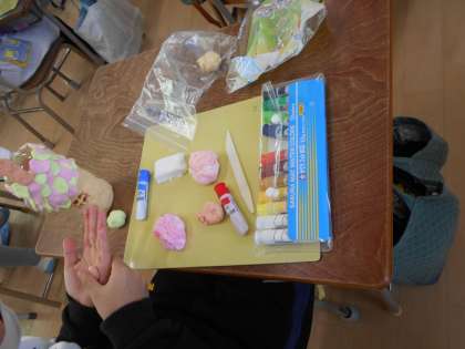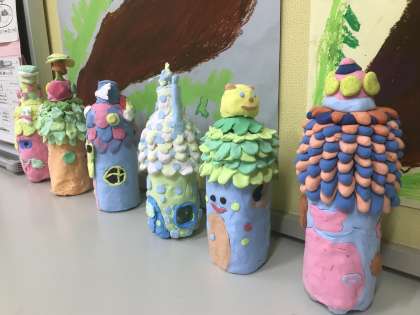 『カラフルハウス』が完成しました。最初の時間に説明した色粘土の作り方をみんな習得して、必要な色粘土を手早く作ることができるようになりました。屋根を立体的につけていくのが難しかったですが、指のはらや粘土ベラを使い、自分の思う形にしていきました。最後に飾り付けをして、お菓子の家、ゴーストハウス、クリスマスツリーハウス、すてきな家が出来上がりました。