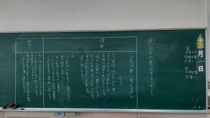 旅行に行くなら「海」か「山」でそれぞれのおススメポイントを体験をもとに話し合いました。「みんなでみた夕日がきれいだったから海がいい」「大自然を感じられたり、川で釣りができるから山がいい」と色々な体験や思い出ををもとに説明することができました!