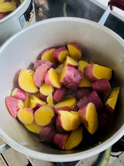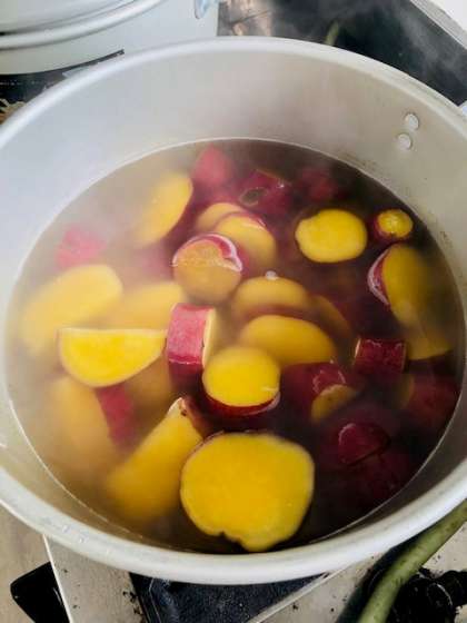2年生が一生懸命水やりをしたり雑草抜きをしたりして育てたさつまいもを食べる日が、ついにやってきました!!前日にきれいに洗って土を落とし、今日は1時間目から家庭科室で三好先生と來田さんが調理をしてくださいました。とてもきれいな色です。みんな教室でワクワクしながら待ちました。
