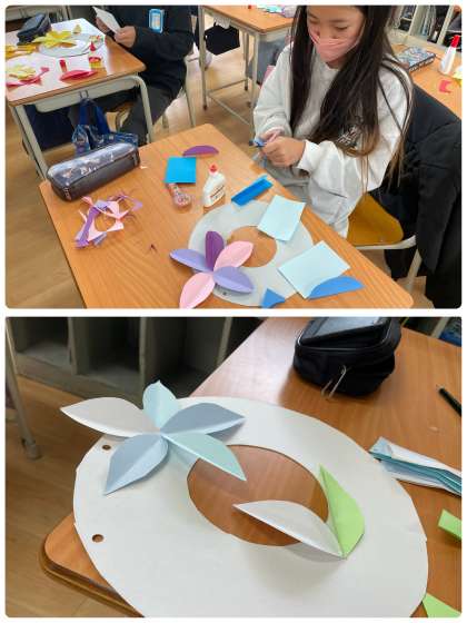 今は、クリスマスリースを作っています!6月に作ったアジサイの切り方を活かして、ポインセチアの花を作りました。それぞれが好きな色を選んで、色鮮やかな花ができました。次回はクリスマスのかざりを作っていきます!持って帰ってかざってもらうのが楽しみです。