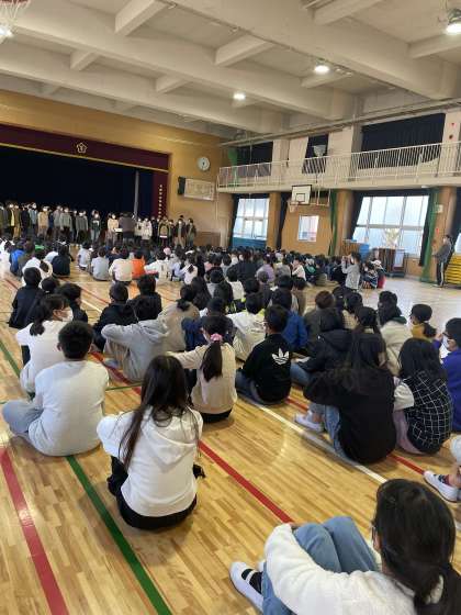 今日は、6年生の修学旅行へ行ってきます!の集会がありました。千羽鶴の奉納の話や、HEIWAの鐘の合唱の披露もありました。