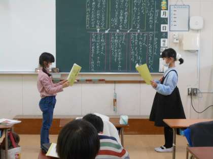 『お手紙』の学習では、四場面の役割演技をしました。「自分には手紙なんて来るもんか。」と投げやりになるがまくんと、かたつむりくんが手紙を配達してくれるのを今か今かと待つかえるくんのやりとりでは、回数を重ねるごとにせりふの言い方がどんどん上手になっていきました。がまくんとかえるくん役を募集すると、半分以上の人が挙手して立候補しました。チャレンジしようという気持ちがすてきです。