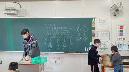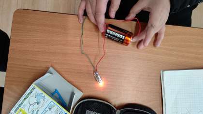 今日は電池で電球をつけるにはどうすればいいかを考えました。