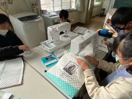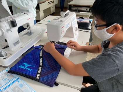 しつけ糸を縫ってミシンで縫ってひもを通して…なかなか時間がかかりましたが、友だちと教え合うなど協力しながら頑張りました。