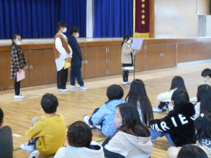 終業式で2年生の代表の人たちが作文を読みました。1組代表の人は九九といもほりについて、2組代表の人は学習発表会について書きました。代表の2人は声の大きさや明るさ、読むスピードを調整して読む練習を重ねてきました。クラスや学年の友だちの前で読んで、緊張感に慣れる練習もしました。今日は「2年生、5年生、お願いします。」と呼ばれると、「〇〇、がんばれー!」と、クラスの友だちから小さな声で、でも、とても心強い、エールが送られました。他の学年の人たちも、シンとして聞き、大きな拍手を送ってくれました。代表で作文を読んだのは2人でしたが、2年生の一人一人が努力をしたりやり遂げたりし、大きく成長した2学期でした。