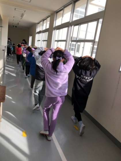 地震発生を想定した放送が鳴ると、児童は自分の机の下に早くもぐり、頭を守りながら揺れが落ち着くまで待ち、放送後、避難ルートを使って素早くグラウンドに移動することができました。津波発生時の訓練でも、「お」「は」「し」「も」を意識し、どの学年も静かに落ち着いて校舎の3階まで避難することができました。