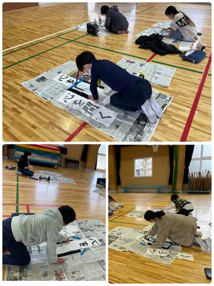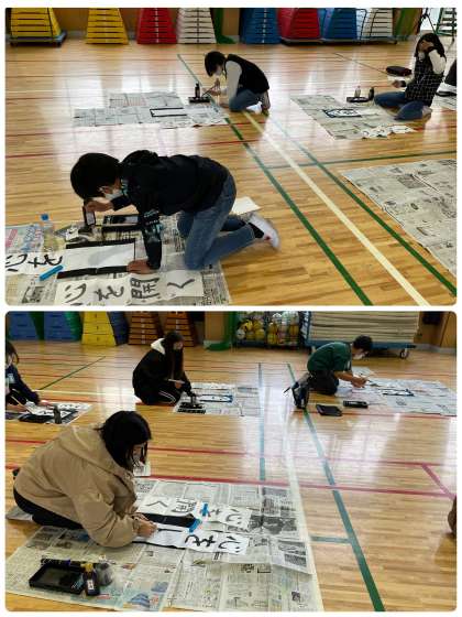今日は講堂で書き初めをしました!心を開くという4文字を書きました。みんなとっても真剣に取り組みました。講堂で習字をすることが、新鮮な感じがしました。集中して取り組んだので、とてもいい作品ができました。教室掲示が楽しみです!