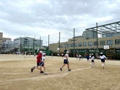 神津体操をした後、グラウンドを自分のペースで走ります。これまでは途中で歩いてしまう人もいましたが、今日はほぼ全員が歩かずに最後まで走り切ることができました。
