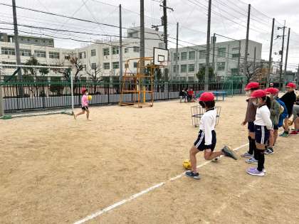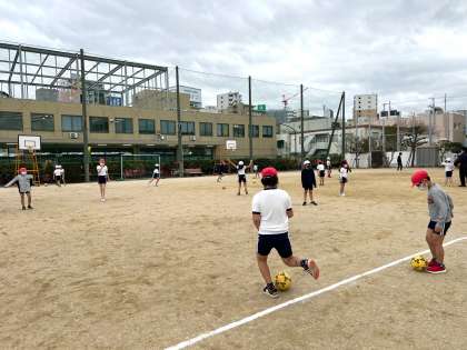 その後、サッカーを行いました。まずは基本のパスの練習です。2回目ということもあり、フォームだけでなく、うまく足に当てるコツや遠くに飛ばすコツなどが身に付いてきました。シュート練習では、良いシュートが決まると拍手が起きたり、ゴールにボールが入らなくても「惜しい!」という声が聞こえてきたりと、友達と励まし合いながら良い雰囲気で取り組むことができていました。