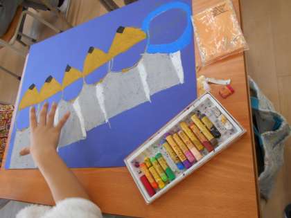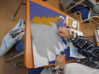 『かさこじぞう』の文章を読んで絵に表す続きをしました。今日は、雪をかぶったじぞうさまに色を塗り込みました。国語の時間に、じぞうさまが立っているのは「ふきっさらしの野っ原」で風と雪が強く吹き付ける様子を学習したので、じぞうさまがかぶっている雪は片側だけ、と意識して表現している人が多くいました。たくさん塗り込まなければならなりませんでしたが、教科書の文章を思い出しながらていねいに取り組んでいました。