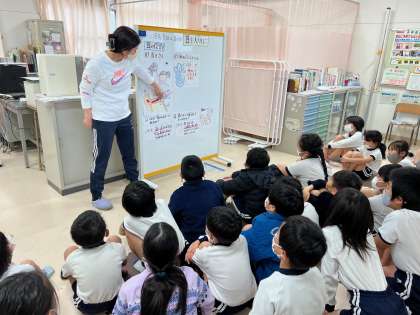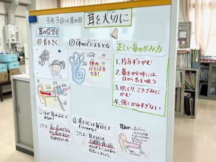 はじめに、米田先生から「耳」についてのお話がありました。耳の構造が分かりやすく描かれたイラストを見て、「耳ってこんなふうになってるんやー!」と、みんな興味津々な様子でした。また、「3月3日は何の日でしょう?」と聞かれると、「耳の日!」と答えることができ、「音を聞く以外で、耳にはどのような働きがあるでしょう?」と聞かれると、「体のバランスをとる!」と答えることができました。子どもたちの知識の豊富さに感心させられました。