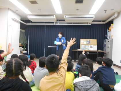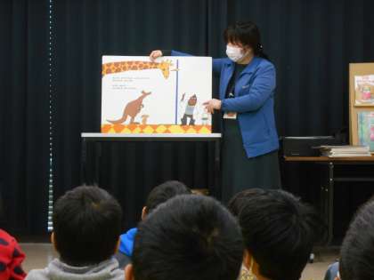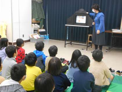 続いて2階の集会室に入り、図書館のしくみや利用の仕方についての紙芝居を読んでもらいました。また、置いてある本の種類について、さらに詳しく教えていただきました。例えば、『ぐりとぐら』は、日本語・中国語・韓国語・英語と、4ヶ国語置いてあります。また、赤ちゃん用の本は、赤ちゃんが怪我をしないように、本の角が丸くなっていたり、めくりやすいように紙が分厚くなっていたりという工夫がされています。みんな興味津々で聞き入っていました。説明の後は「淀川図書館には何冊ぐらいの本がありますか。」「働いている人はどんな仕事をしていますか。」「一番大変なことは何ですか。」「カードを作りたいですが、どうしたらいいですか。」など、たくさんの質問に答えていただきました。最後は、大型絵本の読み聞かせをしてもらいました。楽しみながらしっかり学ぶことができた、充実した時間になりました。