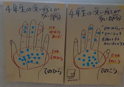 洗い残しが多い部分にシールを貼ったものを、学年の廊下に掲示し、手を洗う時に意識しやすいようにしました。どの学年も、「てのこう」や「てのひら」「ゆびのあいだ」が洗えていませんでした。現在、新型コロナウイルス感染症だけでなく、インフルエンザも流行中です。「手洗い」は感染予防の1つです。ぜひ、ご家庭でも手洗いについてお話していただけたらと思います。