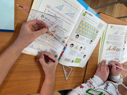 算数科で「三角形」の学習が進んでいます。今日は、三角定規を用いて角の大きさくらべをしました。紙に三角定規の形を写しとり、その紙を折ったり重ねたりしながら、