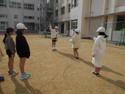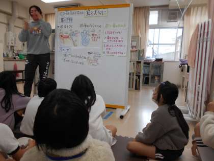今日は発育測定でした。最初に、米田先生から耳のお話をしてもらいました。耳には「音を聞く」という役割の他に、「体のバランスをとる」という大切な役割があります。外から見えるのは耳介だけですが、その奥がどうなっているのか、図を見ながら説明してもらいました。耳そうじの仕方、耳の怪我、鼻のかみ方(耳と鼻はつながっています)についても教えてもらいました。お話を聞いた後は身長と体重を測り、残った時間は運動場で鬼あそび、ボール投げ、長縄とび、鉄棒などをしました。長縄とびは、とぶだけでなく、回すのも上手な人が増えました。