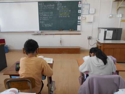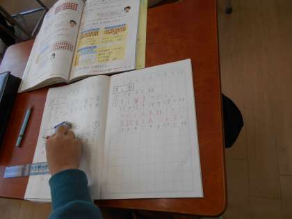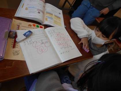 算数では「九九のきまり」を学習しています。2学期に努力して九九を覚えた成果もあって、スムーズに学習を進められる人が多いです。今日は、縦に4個、横に12個並んだりんごの数を「12×4」の式で求める方法を考えました。前時で「4×12」の計算を学習したので、「かけられる数とかける数を反対にして計算しても答えは同じだから、12×4の答えは48」と考える人が一番多かったです。「12ずつ足していく。」「12ずつ増えることを使う。」と、既習事項を活かして他の考え方をする人もいました。最後は「12×5」を自力で解いてみました。早く解き終わった人は、まだの人に説明しに行っていました。