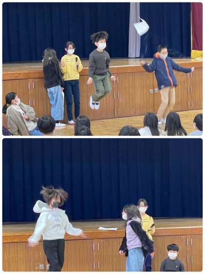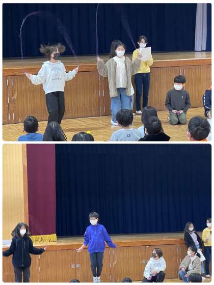 今日の朝会では今週から始まるなわとび週間について、運動委員会から発表がありました。なわとびの技を見せたり、大縄の八の字を見せたりしてくれました。運動委員会のすごい技を見て、全校生徒がやる気を出したように感じました。今日は雨でできませんでしたが、明日から4日間みんなで楽しくなわとび週間ができたらいいですね!