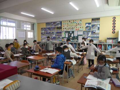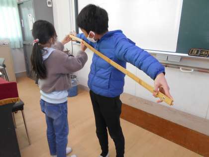 「100cmをこえる長さ」の学習に入りました。まず黒板の横の長さを調べると、両手を広げた友だち3人分でした。次に教室の横の長さを調べると、両手を広げた友だち7人分でした。「教室の長さの方が4人分長い。」とわかりましたが、両手を広げた長さは人によって違うので、正確な長さはわかりません。そこで、自分が両手を広げた長さが何cmかを調べました。友だちと協力して100cmものさしと30cmものさしを組み合わせて一生懸命測っていました。120cm前後の長さになる人が多かったようです。その後、「100cmは1mとかき、1メートルとよむ」ということを学びました。