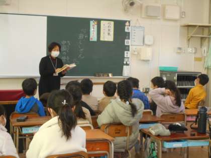 今日は中国の昔話『岩じいさん』を聞きました。兄にもらったクワを一本とミノを一枚だけ持って家を出た弟が荒れ地の整備に精を出し、そのお礼に岩じいさんから銀を袋いっぱいもらいます。それを知った兄は自分も銀をもらおうとして…というお話です。絵本ではありませんでしたが、みんな集中して聞き、お話の世界に引き込まれていました。